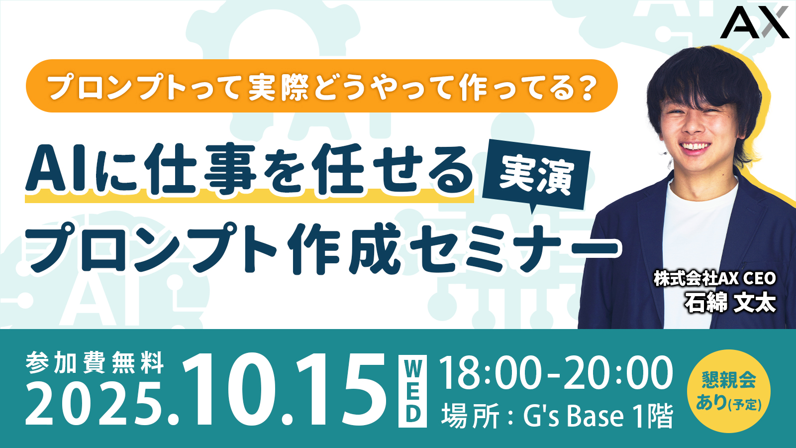 株式会社AX代表・石綿文太が、G’s ACADEMY(福岡市)開催の「AIに仕事を任せるプロンプト実演セミナー」に登壇します。