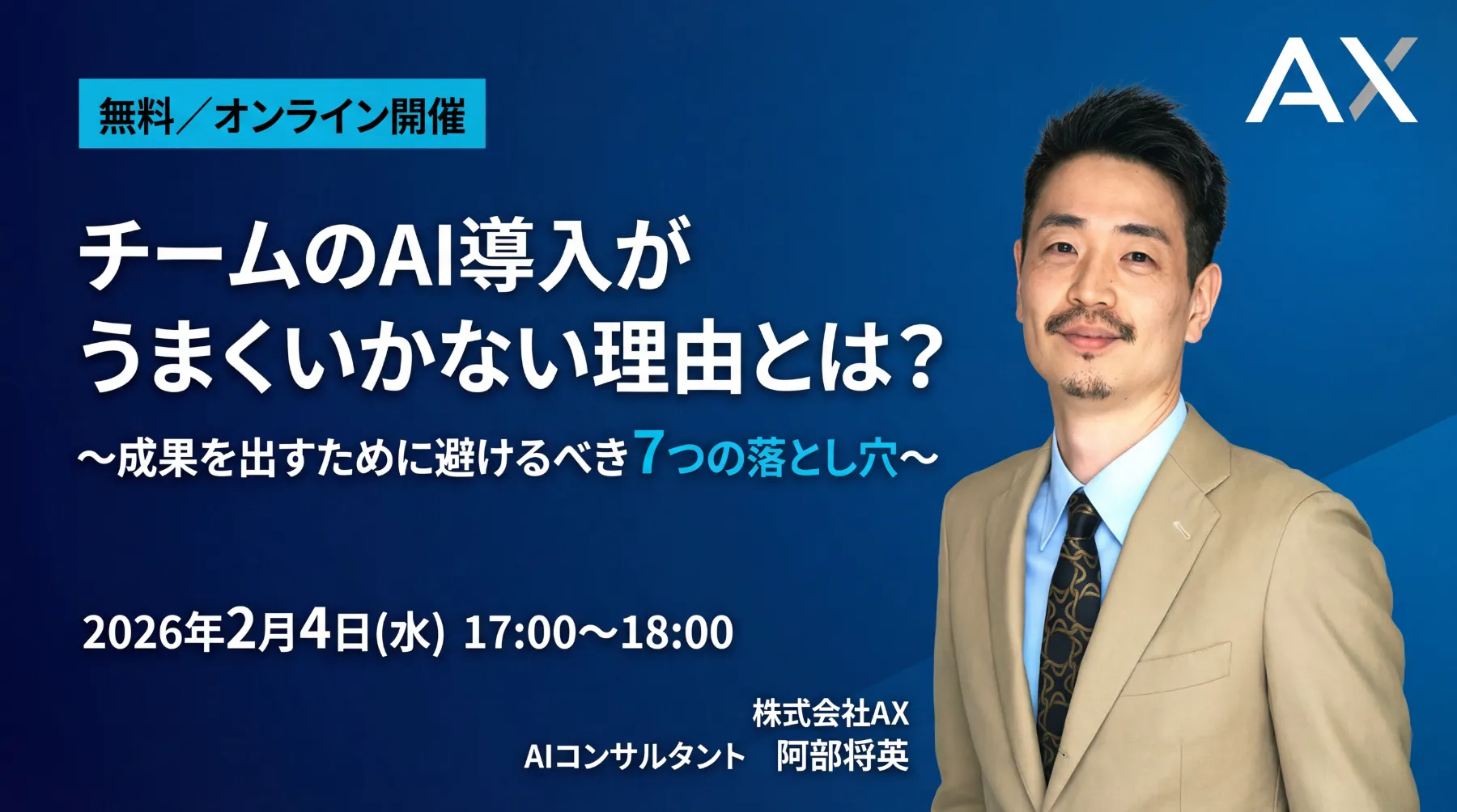 株式会社AXは、AI導入がうまく進まない企業に向けて、オンラインセミナー「チームのAI導入がうまくいかない理由とは?〜成果を出すために避けるべき7つの落とし穴〜」を開催します。